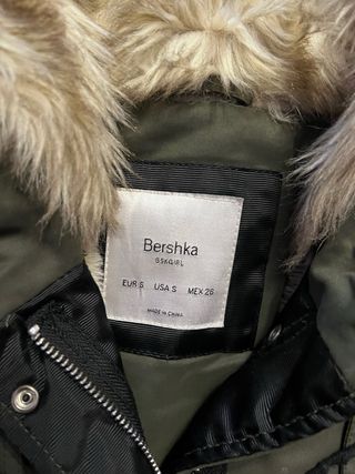 Abrigo tipo parka de Bershka en color verde, ideal para el frío. - Capucha con pelo sintético. - Cierre de cremallera. - Bolsillos frontales con solapa y cremallera. - Cordones ajustables en cintura y bajo.