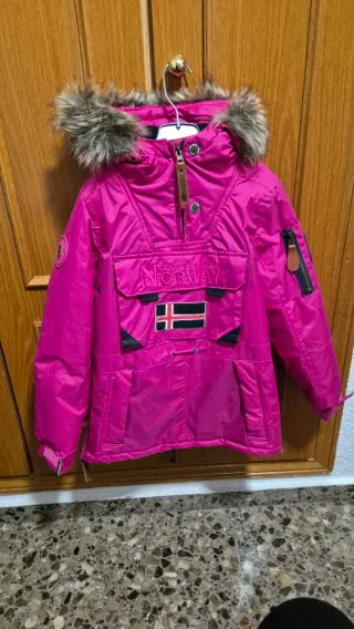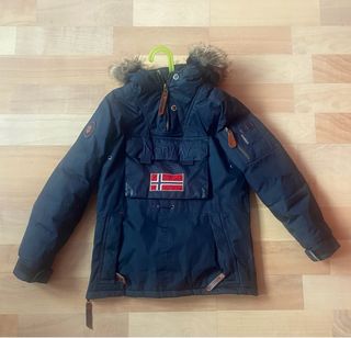 Chaqueta de Geographical Norway para niño, con un diseño moderno y funcional. - Capucha con pelo. - Bolsillo frontal grande. - Bandera de Noruega en el pecho. - Cierre de cremallera y botones a presión.