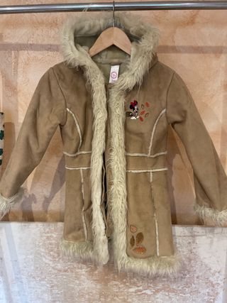 Abrigo de invierno para niña con capucha y detalles de Minnie Mouse. - Diseño tipo parka. - Forro interior de pelo sintético. - Adornos de hojas bordadas. Faltan botones