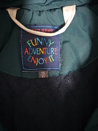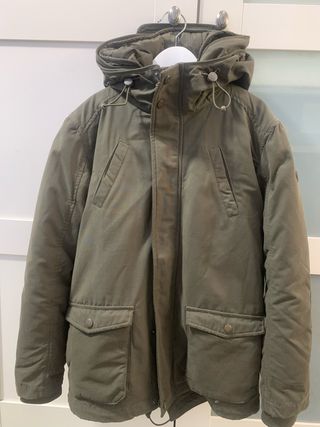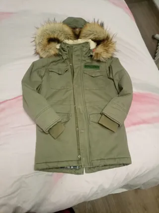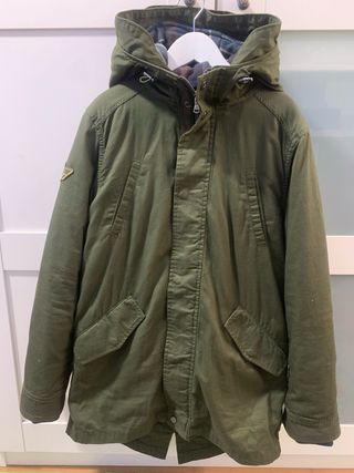 Parka de la marca Scalpers para niño en color verde. Cuenta con capucha y forro interior a cuadros. La parka tiene 2 partes, unidas por cremallera ( para mas frio o menos) - Talla 12. - Cierre de cremallera. - Bolsillos frontales con solapa. - Detalle de parche en manga.
