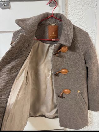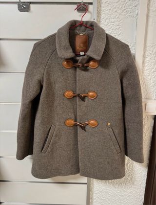 Trenca de paño para niño, ideal para el frío. - Cierre con botones de madera y cordón. - Capucha. - Bolsillos delanteros.