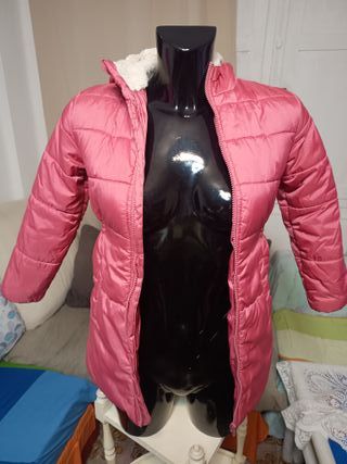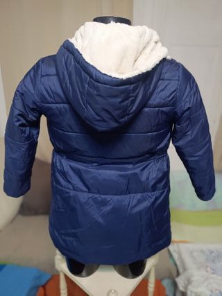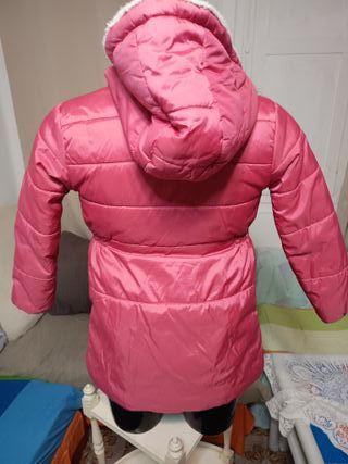 Abrigo tipo parca para niña. Tiene un pequeño desgaste en el botón, lo muestro en una foto, por lo demás está muy bien. La talle es para niñas de 2 a 3 años - Diseño con capucha forrada de borreguito. - Cierre de cremallera.
