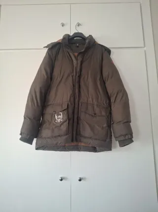 Parka de la marca Scalpers para niño en color verde militar. La parka tiene dos partes, unidas por cremallera. Para usar dependiendo del tiempo. - Talla 12. - Capucha ajustable. - Bolsillos frontales con solapa. - Cierre de cremallera y botones.