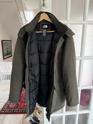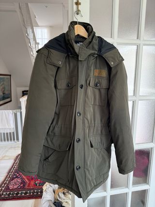 Parka de la marca The North Face en color verde militar. Diseño con capucha y múltiples bolsillos. Talla S. Hombre. - Capucha con pelo. - Cierre de cremallera. - Bolsillos frontales con solapa. - Puños ajustables.