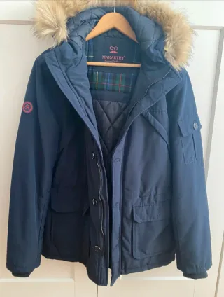 Cazadora de la marca Makarthy en color azul marino. - Diseño con capucha y pelo. - Cierre de cremallera y botones. - Bolsillos frontales. - Puños elásticos. En perfecto estado. Apenas uso Precio original 149€