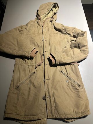 Parka de hombre con forro interior de borreguito. Ideal para el frío. De la marca Weatherproof. Talla M. De color marrón. Está en buen estado!!! - Cierre de botones y cremallera. - Capucha ajustable con cordón. - Cintura ajustable con cordón interior. - Bolsillos frontales con cremallera.