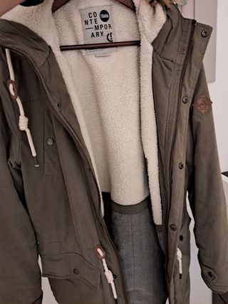 parka fina con capucha que se puede quitar , tiene un chaleco dentro fino pero abriga un poco