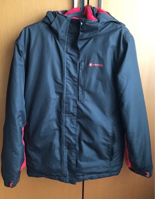 Chaquera para la nieve en negro y rojo. Lleva cremallera y belcro, 3 bolsillos con cremallera en el exterior y dos bolsillos interiores, otro bolsillo en la manga izquierda con cremallera, capucha desmontable y ajuste interior tambien desmontable, con puño y ajustable. Muy calentito. Talla 14 años.