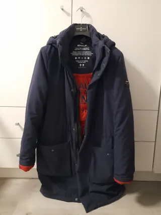 Parka de la marca Ecoalf con un diseño moderno y funcional. Perfecta para mantenerte abrigado con estilo. - Color exterior azul marino. - Forro interior de color rojo vibrante. - Capucha integrada. - Bolsillos frontales con solapa.