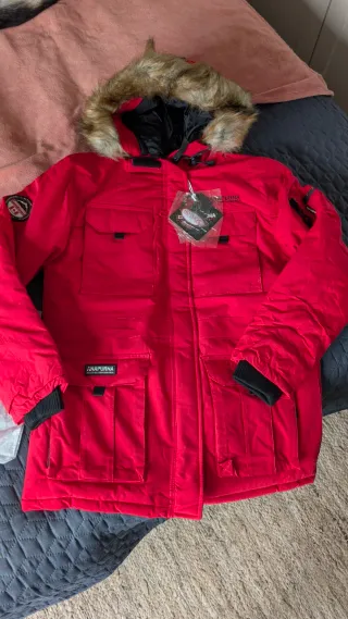 Chaqueta de la marca Geographical Norway en color rojo. - Diseño acolchado. - Capucha con pelo. Su precio fueron 350€ Está completamente nueva! Me queda pequeña y necesito comprar una talla más grande. Bolsillo frontal tipo canguro. - Bandera de Noruega bordada. - Cremalleras laterales.