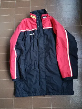 Parka vintage de la marca Fila, con un diseño bicolor en negro y rojo. Esta bastante bien, le falta la capucha y 4 botones centrales, pero la cremallera funciona bien y estan los botones de arriba y abajo, por lo que sigue cerrando completamente. El resto de cremalleras funcionan bien.