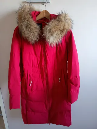 Abrigo tipo parka de la marca Columbia en color rojo. Cuenta con capucha con pelo. Talla M pero parece una L. Precio en tienda 490€ - Cierre principal con cremallera. - Dos bolsillos inferiores con solapa. - Dos bolsillos superiores con cremallera. - Puños ajustables.