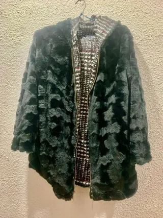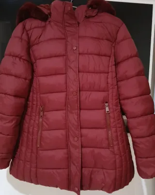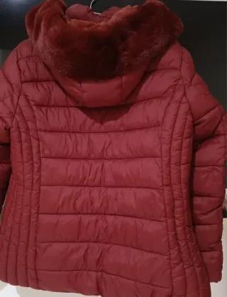 Parka de invierno con capucha y detalles de pelo. - Cierre de botones y cremallera. - Bolsillos laterales con cremallera. - Diseño acolchado. - Felpa suave en el interior - Con cinturón Es muy comoda, no pesa y abriga. Excelente prenda. En perfecto estado.