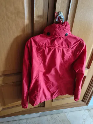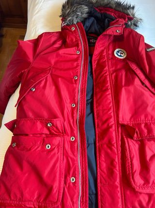 Parka Napapijri de color rojo, ideal para el frío. - Diseño con capucha. - Bolsillo frontal grande. - Cierre de cremallera y botones. - Detalle de bandera en el pecho. Solo se uso un par de veces