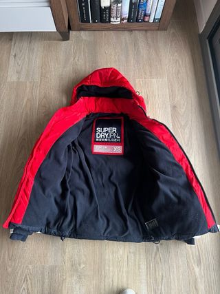 Anorak Superdry con un diseño moderno y llamativo. - Combinación de colores rojo, blanco y negro. - Capucha integrada. - Cierre frontal con cremallera.