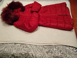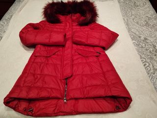 Chamarra acolchada marca Mimi Mua talla S. El pelo del gorro es desmontable y también el gorro es desmontable. Tienes la opción de llevar el gorro con o sin pelo. Es un color rojo pero no rojo intenso.