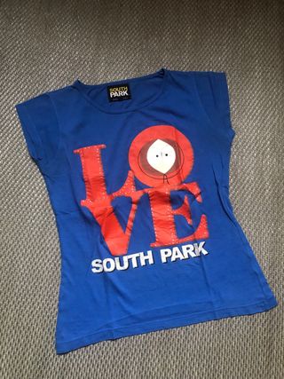 Lote de siete camisetas variadas, todas en talla M. - Camiseta gris con estampado. - Camiseta verde con estampado de estrella. - Camiseta amarilla con estampado free. - Camiseta a rayas rojas y blancas. - Camiseta con estampado tie-dye. - Camiseta azul de South Park. - Camiseta amarilla floral con nudo.