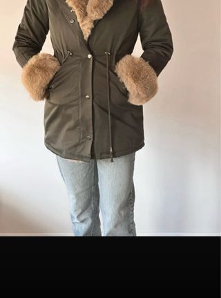 Chaqueta estilo parka con capucha y pelo sintético. - Cierre de cremallera y botones a presión. - Cintura ajustable con cordón. - Bolsillos frontales con solapa. - Tiene unas manchas en una manga que no sé si se quitan