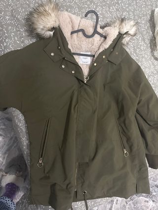 Chaquetón estilo parka con capucha y forro interior. - Cierre de cremallera y botones. - Bolsillos con cremallera en las mangas. - Detalle de pelo en la capucha, desmontable. - Abrigo de invierno super calentito.