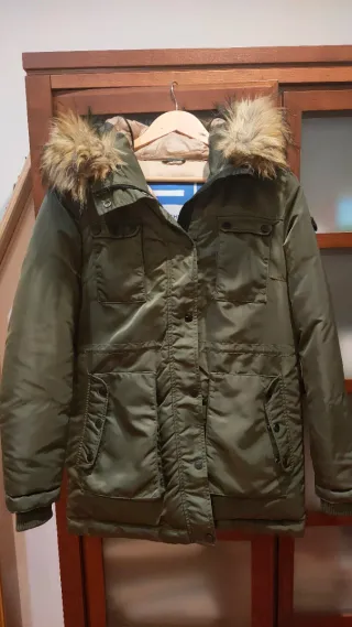 Parka verde Pull & Bear, talla S, tanto la capucha como el cuello de borreguito se pueden quitar