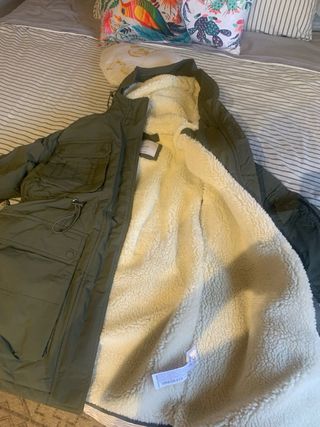 Parka de Mango en color verde. Va con forro de borreguillo que se puede quitar y queda una prenda para primavera. Medida de sisa 50 cm - Cierre principal con cremallera. - Dos bolsillos frontales con solapa y botón. - Dos bolsillos superiores con cremallera. - Puños ajustables.