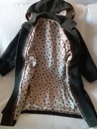 Abrigo tipo trenca para niño con capucha.Talla 6 - Cierre con botones y cuernos.trabillas cuero - Bolsillos delanteros. - Diseño clásico. forrada paño cuadros verdes Talla 6 largo 56 ancho 43 manga largo 36 ancho 14