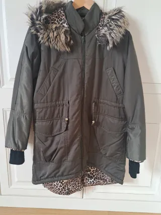 parka verde y pelo leopardo en el interior. Es muy calienta. se le quita el forro de dentro con lo que sirve para primavera e invierno. En el bolsillo lateral del brazo le falta una pegatina (de las de pegar con plancha)que quite porque no me gustaba. Se puede poner lo que se kiera. Talla Xs pero yo uso una S. ajustable en cintura.