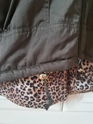 Cazadora de mujer con capucha y detalles llamativos. Talla S , talla amplio - Capucha con pelo sintético y estampado de leopardo. - Forro interior con estampado de leopardo. - Puños de punto negro. - Bolsillos frontales con solapa.