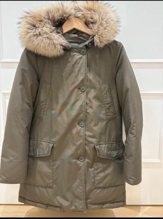 Parka Arctic de Woolrich en color verde, talla M. Cuenta con un cálido forro y capucha con pelo. - Cierre de botones y cremallera. - Bolsillos frontales con solapa. - Puños ajustables.