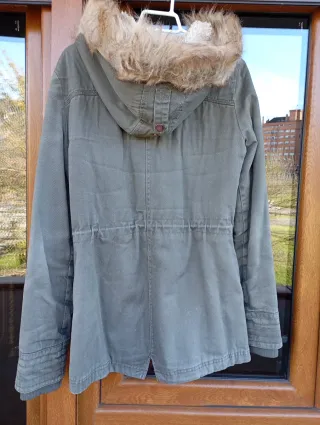 Chaqueta de estilo parka en color verde, ideal para el frío. muy poco uso, mido 1,70 y para hasta unos 70kg va bien - Capucha con detalle de pelo. - Forro interior naranja. - Cordones ajustables en cintura y bajo. - Bolsillos frontales con solapa.