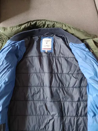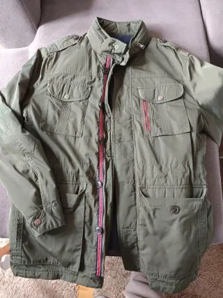 Parka de la marca Green Coast en color verde caqui. Diseño con múltiples bolsillos y cordón ajustable en la cintura. - Cuello con solapa. - Cierre de botones a presión. - Dos bolsillos superiores con solapa. - Dos bolsillos inferiores con solapa. - Cordón interior para ajustar la cintura -Muy poco uso, lo unco que tiene es por dentro de la solapa una tira del roce de la pana con la cremallera que se ha rozado