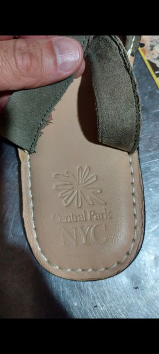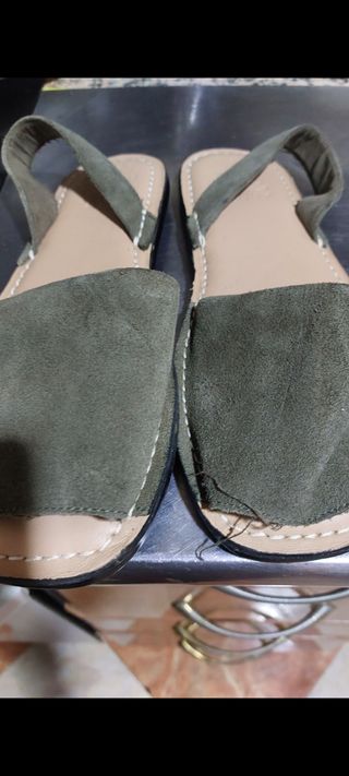 Sandalias planas de la marca Central Park NYC, color verde oliva. Son nuevas a estrenar, aunque presentan un pequeño desperfecto en una de las sandalias (ver foto). - Fabricadas con ante. - Diseño de menorquinas. - Talla única (comprobar medidas).
