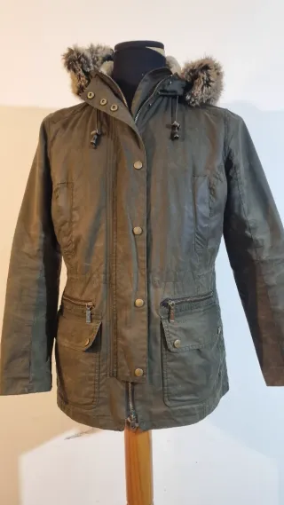 Parka Kelsall en buen estado, tiene 2 descoloridos en el interior,(últimas fotos),por lo demás sin rotos,roces o descosidos. Ajustes con cordón en cintura y capota con piel sintética desmontable. interior acolchado Color Verde-Caqui Talla 12 UK Prestad mucha atención a las médidas. 🙏 ⬇️⬇️⬇️⬇️⬇️⬇️ 40 cm hombros 56 cm de axila a axila 60 cm de hombro a manga 76 cm largo Se envía más información si se requiere. Más Barbours de diferentes tallas y modelos en mi armario. Parka Barbour Kelsall wax en color verde. Un clásico de la marca con un diseño funcional y elegante. - Capucha con pelo. - Cierre de cremallera y botones. - Bo