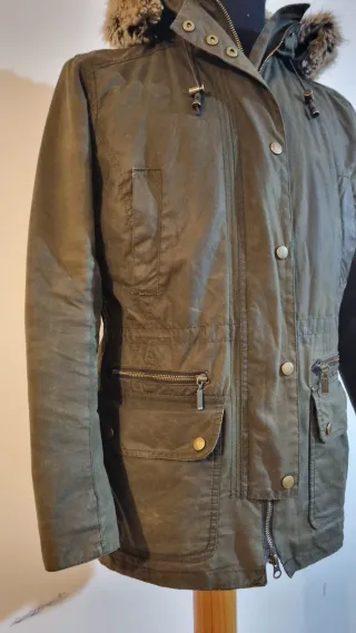 Parka bimaterial de algodon y sintético ( muy suave y agradable al tacto) en color verde oliva. Interior de algodon, cintura ajustable, múltiples detalles. Pone talla XS pero le va a una S. Nueva
