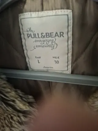Parka de Bershka con forro interior de pelo sintético negro y capucha. - Color verde militar. - Cierre de cremallera y botones. - Bolsillos frontales. - Cordón ajustable en la cintura. Le fakta un boton en el pelito del gorro, pero alguien que seoa coser lo pone sin problema