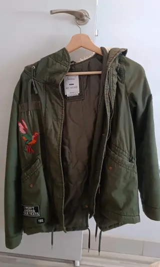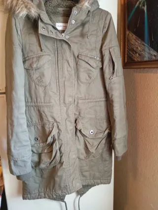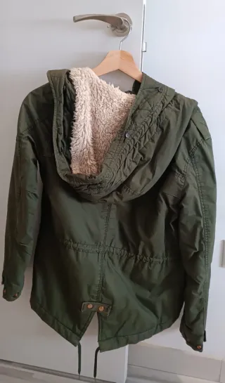 Parka verde militar con forro de pelo muy suave y calentita. Es una talla 16 pero equivale a una S de mujer
