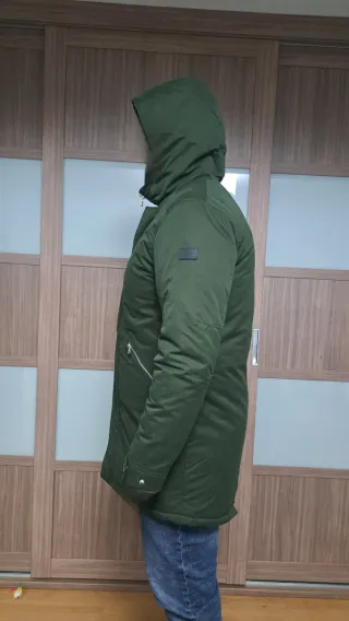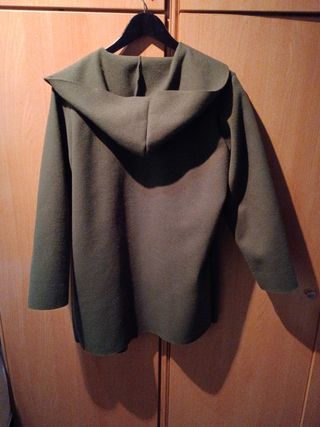 Chaqueta entretiempo, ideal primavera y otoño. Color verde caki. No lleva botones ni cremallera. Bolsillos de plaston. Tiene capucha. Talla L ó XL, la verdad no lo sé.