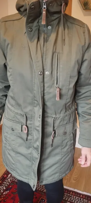 Parka en color verde militar de la marca Primark. Tiene capucha fija, cierre con cremallera y cordones ajustables en la cintura para realzar la figura. Tela ligera pero que abriga . Es una prenda que ha sido usada pero en perfectas condiciones. Me la compré de talla M para que me quedase grande y ancha, para que lo tengáis en cuenta, mi talla es normalmente xs o s/ 34. Podéis comparar con la foto que he puesto de como me queda.