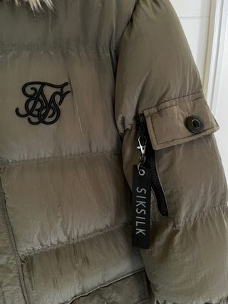 Parka de la marca SikSilk en color verde con un diseño moderno y funcional. Comprado tienda oficial SikSilk online. Talla L. Perfecto estado. - Capucha con detalle de pelo (no desmontable). - Cierre frontal con botones, cremallera y remaches. - Bolsillos en la parte delantera. - Bolsillo interior. - Tejido acolchado. - Logotipo bordado exterior. Cualquier duda por chat. No se admiten devoluciones por error de talla.