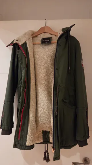 Abrigo tipo parka de la marca Only, ideal para el frío. - Forro interior de pelo sintético. - Capucha integrada. - Cierre de cremallera y botones. - Cintura ajustable con cordón. - Bolsillos frontales con solapa. Yo llevo una M y me abrocha aunque me va justo.
