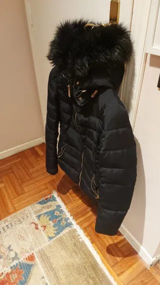 Parka negra. Se puede quitar el forro que va unido con cremallera y el pelo del gorro. En perfecto estado. Talla M pero talla grande, equivale a L