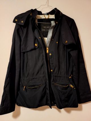 Trenca de la marca Zara Man, con un diseño moderno y funcional. - Color negro. - Con capucha. - Cierre de cremallera. - Bolsillos frontales con solapa y botón. - Bolsillos laterales con cremallera.