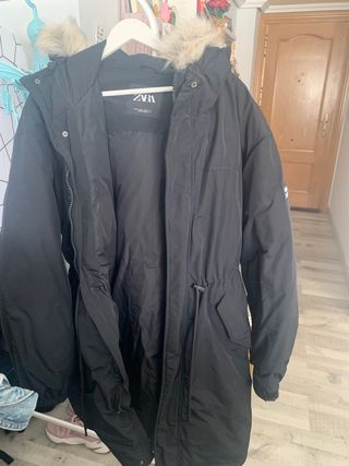Abrigo de zara en color negro! Son dos prendas unidas. La interior es de plumas! Desmontable, perfecto para adaptar según el frío que haga. Lleva capucha. Abriga mucho, perfecto para zonas frías. Lleva múltiples bolsillos. Con capucha y ribetes decorativos. Puede verse sin compromiso. Lleva cremallera y botones!
