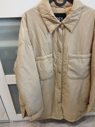 Parka/ Sobrecamisa abrigada de Zara, perfecta para el entretiempo. - Diseño de corte recto. - Cierre de botones. - Dos bolsillos en el pecho con solapa y botón. - Cuello camisero.