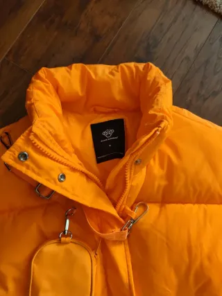 Chaqueta acolchada de la marca Black Bananas en un llamativo color naranja. Un diseño moderno y juvenil. Nuevo, apenas usado un par de horas - Corte cropped. - Incluye un pequeño bolso a juego. - Cierre de cremallera. - Cuello alto.
