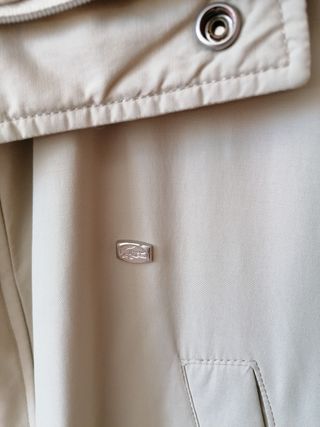 Color beige claro. Corte ajustado y favorecedor, con múltiples bolsillos (dos con cremallera y dos con botón). Tiene cremallera y botones en la parte frontal. Lleva cuello alto interior de punto tipo suéter, ideal para los días frescos. Material suave y cómodo, perfecta para primavera u otoño. En muy buen estado, sin manchas ni roturas.
