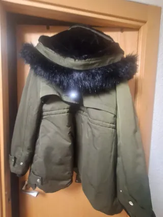 Parka de la marca Zara en color verde. Cuenta con un forro interior de pelo sintético negro y capucha. - Cierre de cremallera y botones a presión. - Bolsillos frontales con cremallera. - Puños ajustables.
