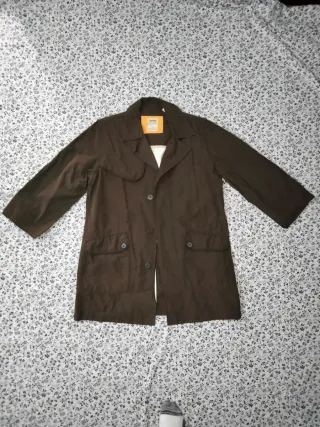Esta prenda es una chaqueta tipo gabardina de la marca Timberland, de color marrón oscuro y con un diseño funcional de estilo "outdoor" o casual. Detalles de la Prenda Marca: Timberland (identificable por la etiqueta naranja característica en el cuello). Color: Marrón chocolate o marrón oscuro. Diseño Exterior: Presenta parches de refuerzo en los codos del mismo tono de la tela y un cierre frontal que combina botones y posiblemente una cremallera oculta. Interior: El forro es de color blanco roto o crema, creando un contraste con el exterior oscuro.