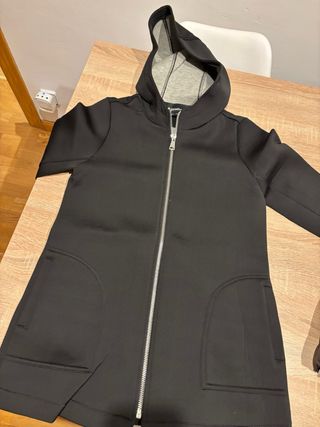 Anorak negro con capucha y cremallera frontal. Tela estilo neopreno. - Diseño moderno. - Bolsillos laterales. - Capucha con forro interior.