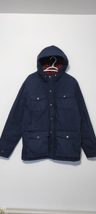 Parka con capucha Element, ideal para el frío. Cuenta con un forro interior a cuadros. -talla L -en condiciones aceptables -envio 24 h - Cierre de botones a presión. - Cuatro bolsillos frontales con solapa. - Puños ajustables.